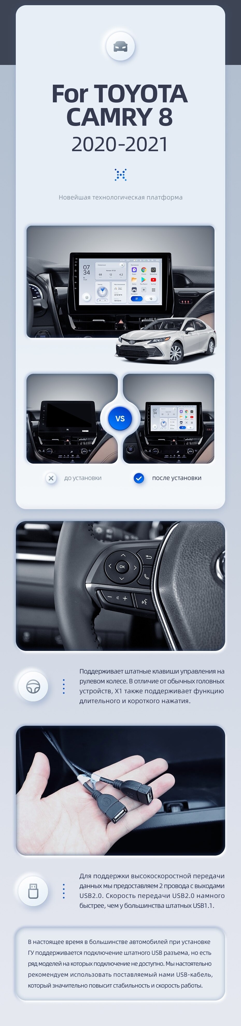 - Мультимедийные возможности: Поддерживает функцию разделения экрана для одновременной работы двух приложений. Имеется встроенный гироскоп и возможность подключения до 6 аналоговых камер.