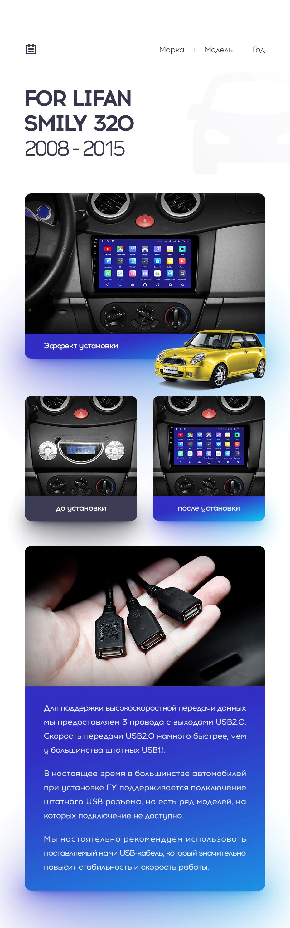 Полный комплект установки магнитолы Teyes с рамкой и проводкой можно выбрать в каталоге штатных магнитол Lifan Smily 320 (2008-2015).