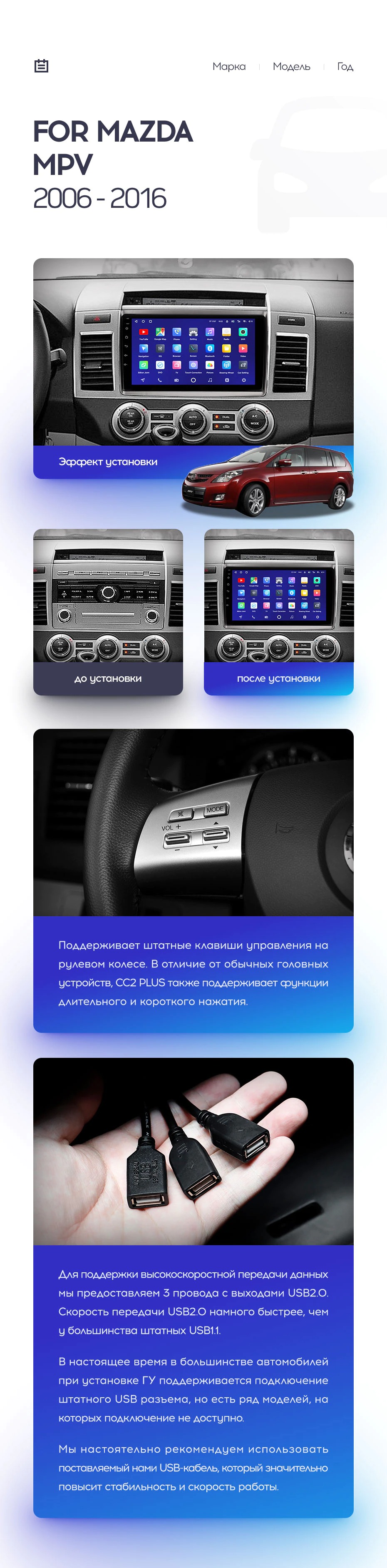 Полный комплект установки магнитолы Teyes с рамкой и проводкой можно выбрать в каталоге штатных магнитол Mazda MPV LY (2006-2016).