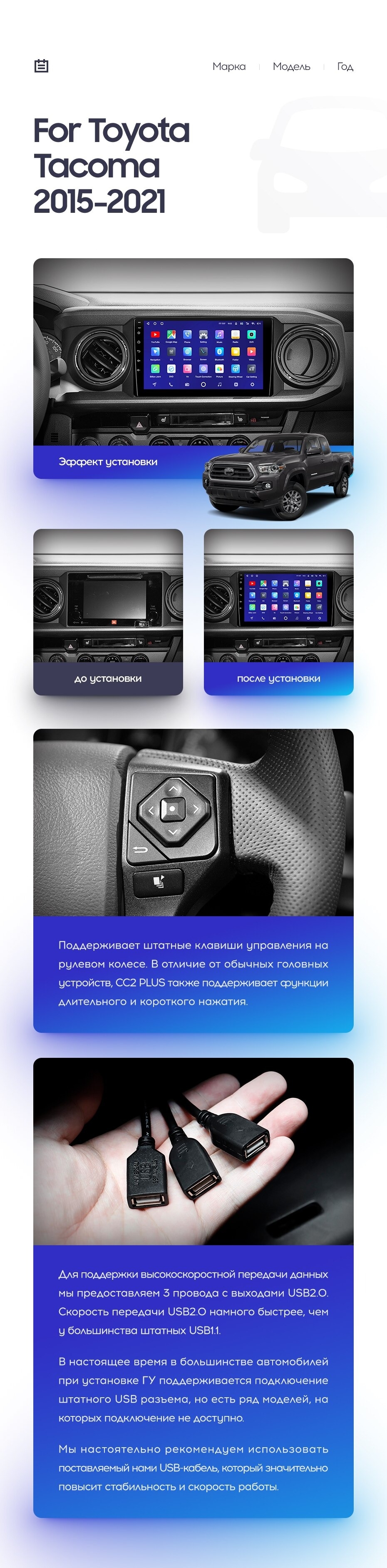 Полный комплект установки магнитолы Teyes с рамкой и проводкой можно выбрать в каталоге штатных магнитол Toyota Tacoma N300 (2015-2021).